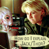 Description: Thor staring at Carter. Carter staring at laptop computer. Carter thought bubble: 'How do I explain Jack/Thor?'
